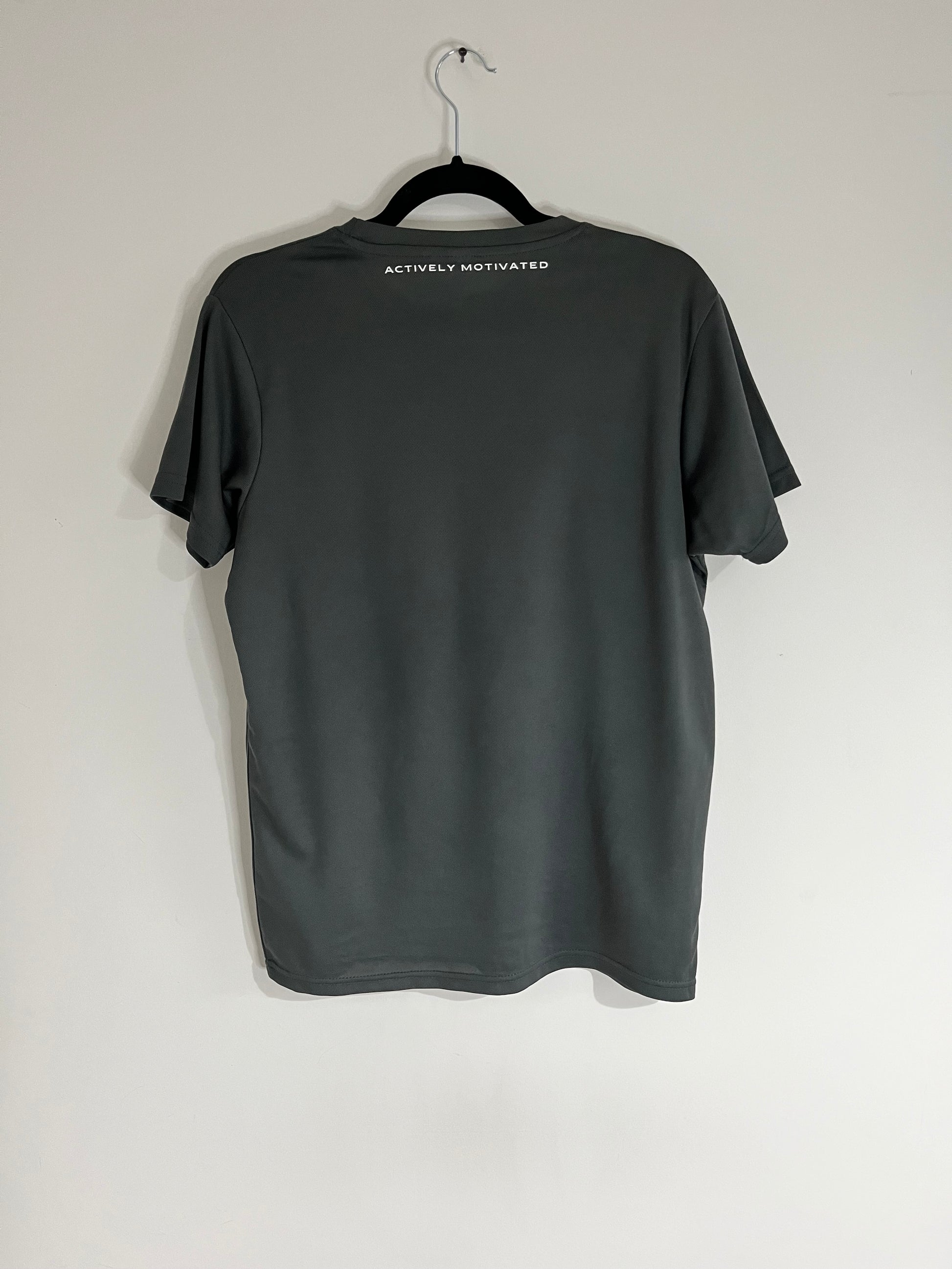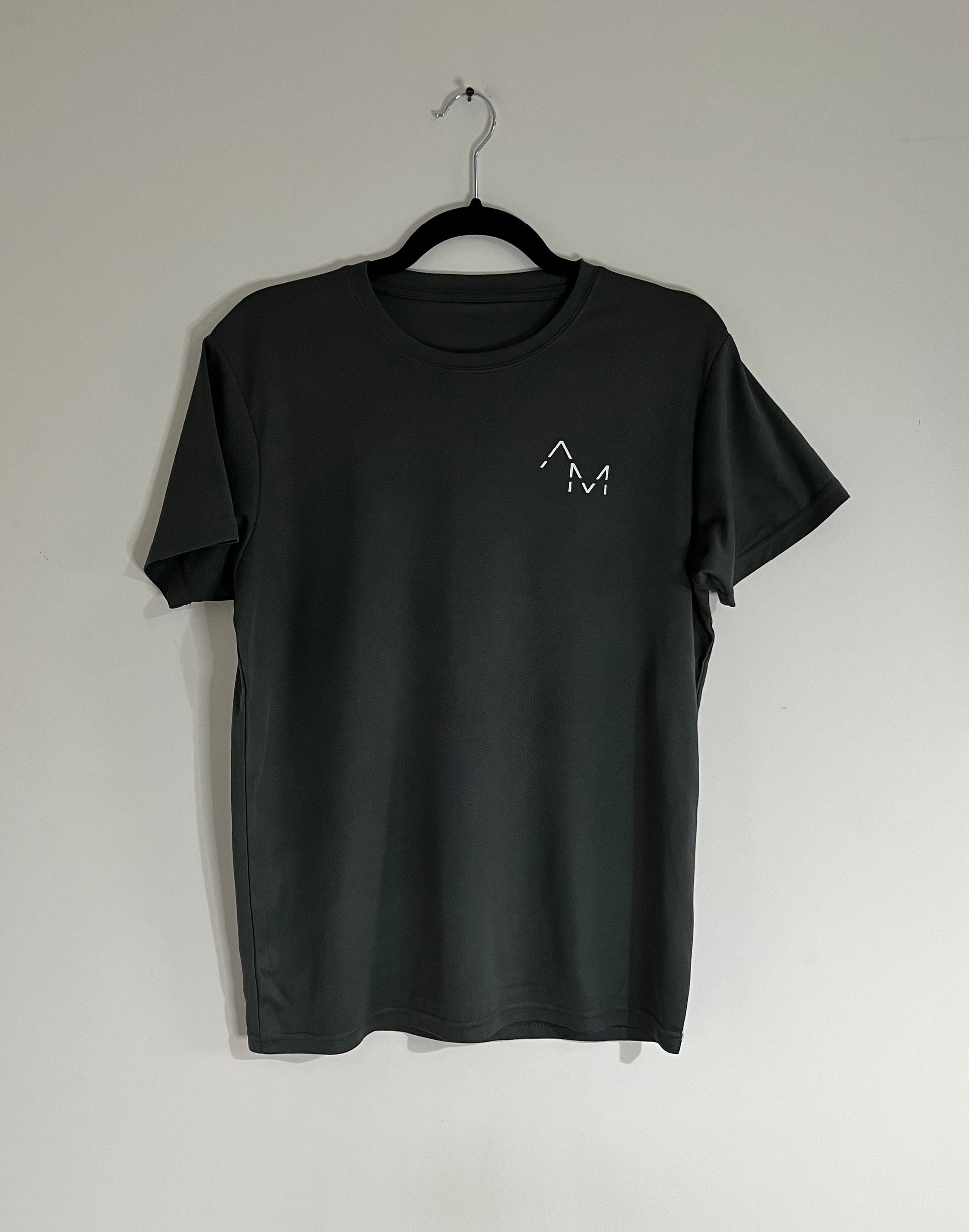 Our AM active T in grey with the new 2023 AM logo design. Great for them intense workouts and long distance runs.
